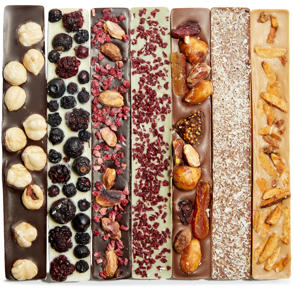 Generous bars of white, milk and dark chocolate transformed with a feast of unforgettable flavours. You’ll find pure white chocolate with blackcurrants, blackberries, and blueberries, or Japanese inspired matcha white chocolate with sour cherries. Combined with milk chocolate there’s tropical toasted coconut or a tantalising combination of nuts, figs and candied orange peel, and for dark chocolate lovers a pistachio and raspberry duo or rich roasted hazelnuts.